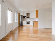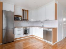 Keittiön varusteet: Jääkaappipakastin, mikroaaltouuni, astianpesukone, liesituuletin, erillisuuni ja liesi. Liesi: Keraaminen liesi. Työtason materiaali: Laminaatti.