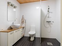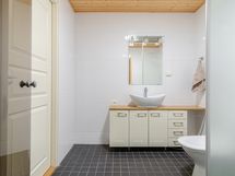Pesutilojen varusteet: Suihku, wc-istuin, bidee-suihku, pesukoneliitäntä, lattialämmitys, peili, allaskaappi ja suihkuseinä.