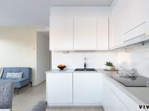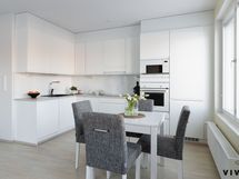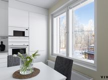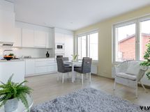- Keittiön varusteet: Jääkaappipakastin, erillisuuni, liesi, astianpesukone, liesituuletin ja mikroaaltouuni. Liesi: Induktioliesi. Työtason materiaali: Laminaatti.