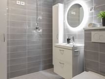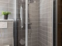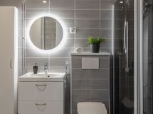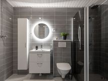 - Pesutilojen varusteet: WC-istuin, suihku, suihkuseinä, pesukoneliitäntä, lattialämmitys, peili, allaskaappi, pesuallas ja bidee-suihku.