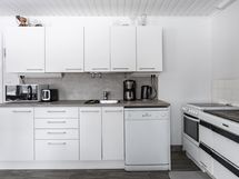 - Jääkaappi, puuhella, liesi keraamisella tasolla, astianpesukone, kaapistot