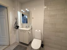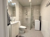 - Varusteet: suihkuseinä, pesukoneliitäntä, WC, suihku, peilikaappi, kiinteät valaisimet, kylpyhuonekaapistot