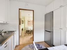 Jääkaappipakastin, keraaminen liesi, liesituuletin, kaapistot, kiinteät valaisimet.