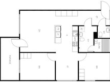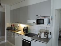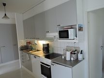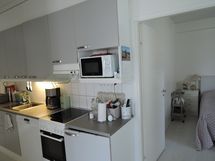 - Liesi: sähköliesi. Kylmäsäilytys: jääkaappi, pakastin. Varustus: liesituuletin, astianpesukone. Isohko ruokailutila johon mahtuu kunnollinen ruokailutyhmä. Tila avautuu osin olohuoneeseen.
