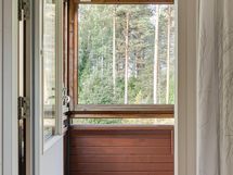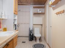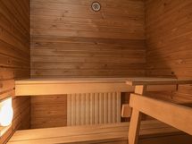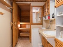 Sauna, sähkökiuas, kylpyhuone, suihku, peilit, kaapit, allaskaappi, pesukoneliitäntä, kiinteät valaisimet.