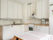 Jääviileäkaappi, pakastekaappi, induktioliesi, liesituuletin, astianpesukone, kaapistot, kiinteät valaisimet.