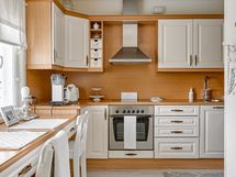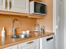 - Keittiön varusteet: Jääkaappi, erillinen pakastin, liesi ja liesituuletin. Liesi: Keraaminen liesi. Työtason materiaali: Laminaatti. Keittiön yhteydessä on ruokailutila tai sen voi hyödyntää myös lisähuoneena (kolmantena makuuhuoneena).