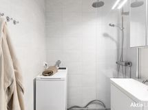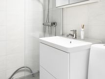 - Pesutilojen kuvaus: Kylpyhuone remontoitu tyylikkäästi vuonna 2022. . Varustus: suihkuseinä, pesukoneliitäntä, lattialämmitys, wc-istuin, suihku, peilikaappi, kylpyhuonekaapisto.