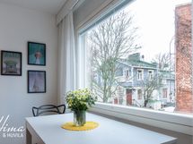 - Asunnon ikkunoista avautuu näkymät Bulevardin sympaattisille vanhoille puutaloille ja upeaan entisen läkkisepänpajan tiiliseinään köynnöksineen. Ensimmäinen kerros (ei katutaso).