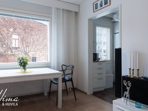 - Näppärä ja tehokas keittokomero suorastaan kylpee luonnonvalossa ison ikkunan ansiosta. Varusteisiin kuuluu vaaleat kaapistot, jääkaappi-pakastin, induktioliesi (01/2024), astianpesukone (2022), liesituuletin suodattimella sekä pieni pyykinpesukone. Lattia laattaa, seinät maalattu.