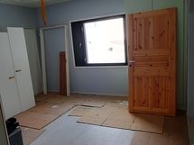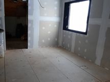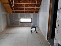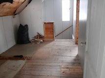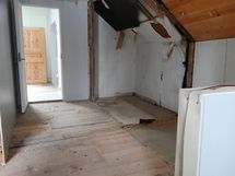 Yläkerrassa on aula ja kaksi makuuhuonetta sekä pesuhuone. Pesuhuoneen remontti on jäänyt kesken. Yläkerran aula on myös kesken kuten kuvista näkyy.