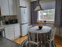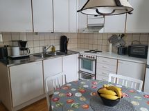 - Paljon kaappitilaa, Suuri tiskipöytä, Laminaattitasot, Jää-pakastinkaappi, Astianpesukone, Keraaminen liesi, Liesituuletin.