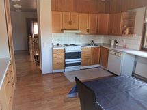 - Tilaa isolle ruokapöydälle, Paljon kaappitilaa, Laminaattitasot, Pesukoneliitos, Sähköliesi, Liesituuletin, Jää-viileäkaappi, Jää-pakastinkaappi