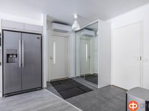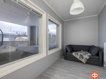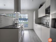 Jääkaappipakastin, induktioliesi, liesituuletin, mikroaaltouuni, astianpesukone, kaapistot, kiinteät valaisimet, pöytätasojen materiaali kivi.