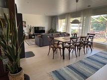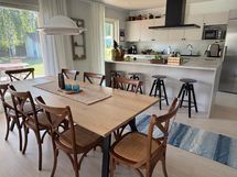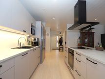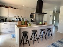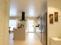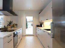 - Keittiön varusteet: Jääkaappi, erillinen pakastin, liesituuletin (Hormiin), astianpesukone (integroitu), erillisuuni ja liesitaso. Työtason materiaali: Laminaatti.