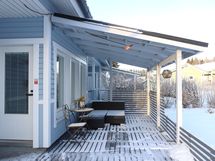 - Terassit molemmin puolin taloa. Sisäpihan puolella valokatettu terassi