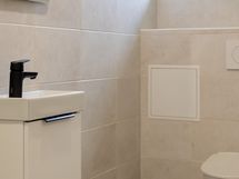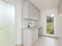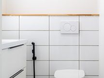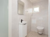Kuvaus: Laattalattia, seinät paneelia, sähkökiuas, lattialämmitys.