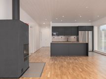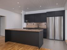 Lattia laatta/parketti, seinät maalattu, laminaattitasot, astianpesukone, mikroaaltouuni, induktioliesi, jääkaappi ja pakastin.