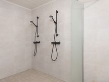 Pesutilojen kuvaus: Laattalattia, seinät kaakelia, kaksi suihkua. Erillisen WC:n kuvaus: Laattalattia, seinät kaakelia, pesuallas, seinä WC-istuin.