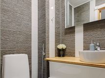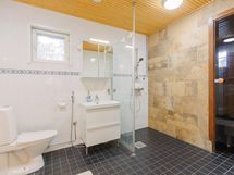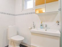 Varusteet: WC-istuin, allaskaappi, pesuallas, bidee-suihku