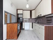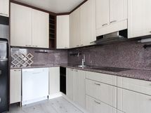 - Vaaleat kaapistot. Laminaattitasot. Jenkkijääkaappi, astianpesukone, keraaminen liesitaso,