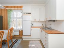 - Työtason materiaali: Puu. Keittiö on täyspuuta ja paikallisen puusepän mittatilaustyönä tehty.