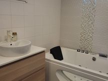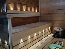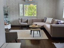 Olohuoneen lisäksi peruskerroksessa on eteinen, wc, keittiö ja makuuhuone. Talon alakerrasta löytyy tilava sauna ja kylpyhuone porealtaalla. Lisäksi siellä on pieni kodinhoitohuone sekä 2 huonetta, joista suurempaa olemme käyttäneet makuuhuoneena.
