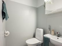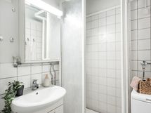 - Kylpyhuone, erillinen wc, suihku, suihkukaappi, peilikaappi, pesukoneliitäntä, kiinteät valaisimet.