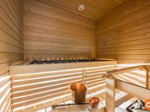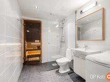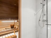 - Sauna, sähkökiuas, kylpyhuone, suihku, suihkuseinä, peilit, allaskaappi, pesukoneliitäntä, lattialämmitys Sähköinen, kiinteät valaisimet.