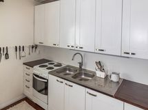 Liesi: sähköliesi. Kylmäsäilytys: jääkaappi/pakastin. Varustus: mikroaaltouuni, varattu paikka astianpesukoneelle. Liesituulettimelle sähköpistokepaikka laitettu. Astianpesukoneelle varaus tehty keittiöremontin yhteydessä.