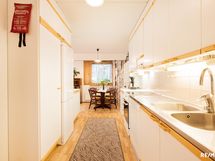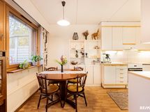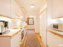 - Keittiössä lattiassa muovimatto, seinät maalattu, välitilassa laatta, pöytätaso laminaattia, tiskipöytä terästä. Varustuksena keraaminenliesi ja astianpesukone, joka uusittu 2016, jääkaappipakastin sekä liesituuletin.