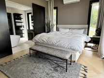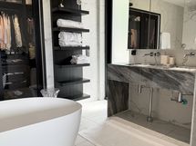 - Pesutilojen varusteet: WC-istuin, suihku (x3), kylpyamme (master-makuuhuoneen kph:ssa), peili, allaskaappi ja lattialämmitys. Pesutilojen kuvaus: Kaksi kylpyhuonetta, master-makuuhuoneen kph:ssa amme. Kolme erillistä wc:tä. Kph ja wc kalusteet Hansgrohe ja Villeroy&Boch, mm. seinä wc-istuimet ja sadesuihkut. Erillisten WC:n lukumäärä: 3. Erillisen WC:n varusteet: WC-istuin, lattiakaivo, allaskaappi, pesuallas, peili ja lattialämmitys.