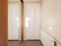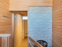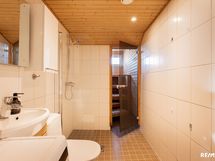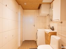 Varustus: pesukoneliitäntä, suihku, pesuallas allaskaapilla, peili, bidee-suihku, wc-istuin, seinäkaappi, suihkuseinä.