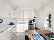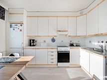 Varustus:jääkaappi/pakastin, liesi/uuni, liesituuletin.