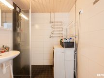 Varustus: wc-istuin, allas, allashana, peilikaappi, suihkuseinä, pesukoneliitäntä, bidee-suihku ja pyyhekuivain.
