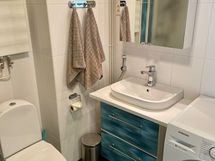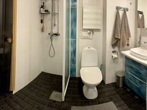- Suihku, Suihkuseinä, Pesukonevalmius, Peilikaappi, Allaskaappi, Laattalattia, Laattaseinä, Pesukone, Lattialämmitys