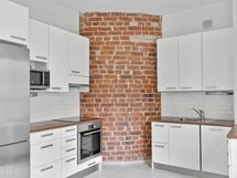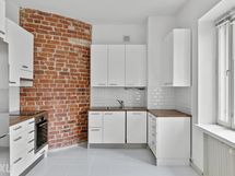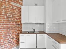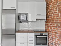 - Keittiön varusteet: Jääkaappipakastin, erillisuuni, liesituuletin, mikroaaltouuni, liesi ja astianpesukone. Liesi: Induktioliesi. Työtason materiaali: Puu. Valoisa, väljä keittiö, mihin ruokapöytä mahtuu hyvin. Ikkuna sisäpihalle.