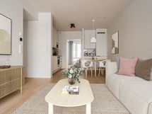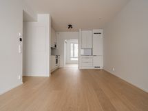 Toimiva kaksio, jossa koko huoneiston levyinen meren suuntaan avautuva lasitettu parveke. Moderni keittiötila ja olohuone muodostavat yhtenäisen tilan, josta on kulku parvekkeelle lasiliukuovien kautta. Makuuhuone rauhoittuu liukuovien taakse. Saunaan luonnonvaloa tuo pieni ikkuna. Säilytystilaa löytyy makuuhuoneen ja eteisen säilytysjärjestelmistä.