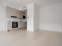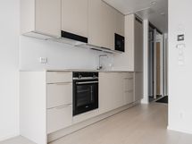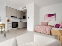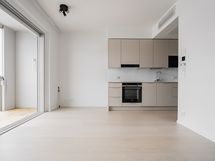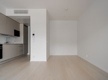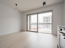 Avara yksiö, jonka moderni keittiötila ja olohuone muodostavat kodissa yhtenäisen tilan. Olohuoneesta käynti koko huoneiston levyiselle lasitetulle parvekkeelle. Makuutila sijoittuu alkoviin ja säilytystilaa tuovat eteisen säilytysjärjestelmät.