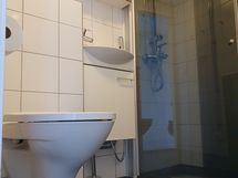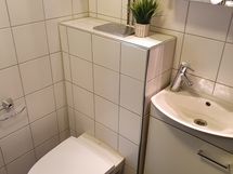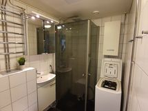 - Suihku, Suihkuseinä, Pesukonevalmius, Peilikaappi, Allaskaappi, Rättipatteri, Laattalattia, Halogeenivalot, Laattaseinä, Seinä WC, Lattialämmitys