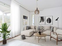 Ilta-aurinkoa kohti avautuva parvekkeellinen asunto. Ikkunat avautuvat talossa rakennuksen reunalla etelään, länteen sekä pohjoiseen. Asunnossa on toimiva kylpyhuone, jossa on oma sauna. Makuuhuoneissa säilytysratkaisuna on vaatehuone tai kaappitilaa. Toimiva keittiö on sijoitettu ruokailutilan yhteyteen. Olohuone sijaitsee erillisessä tilassa. Tilava varastoullakko, jossa seisomakorkeus helpottaa tavaran säilytyksessä.
