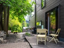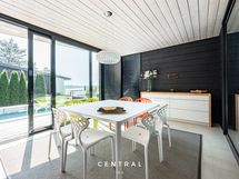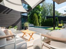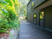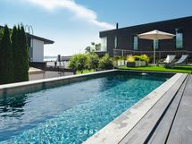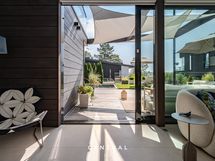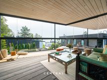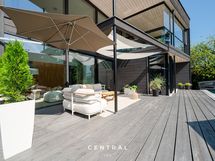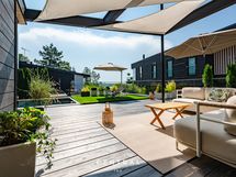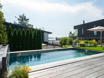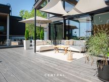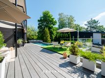 - Yläkerran kaksi suurta parveketta (yhteensä noin 34 m2) ovat täysin lasitettu. Talon ympärillä on noin 110 m2 puuterasseja, sekä 65 m2 graniitti- ja betonikivetyksiä. Talon edessä/etuterassin yhteydessä on 7m x 3m -kokoinen lämmitetty uima-allas.