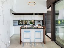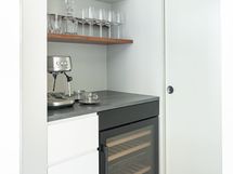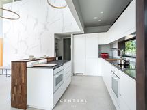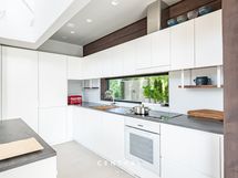 - Keittiön varusteet: Jääkaappi (Integroitu), erillinen pakastin (Integroitu), uuni, liesi, mikroaaltouuni, astianpesukone, keittiösaareke ja viinikaappi. Liesi: Induktioliesi. Työtason materiaali: Corian. Keittiökoneet kaikki Miele -merkkiset. Keittiökalusteiden ovet maalattu mattavalkoisella, laatikoiden avaus sormiuralla. Jääkaappi ja pakastin integroidut. Yläkaappien pohjassa yhtenäinen led-kiskovalaisin. Tasot Corian Carbon Aggregate. Temptechin viinikaappi omassa nurkkauksessaan, jossa taso, laatikostot sekä pähkinäpuinen hylly viinilaseille.
