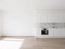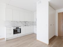 Keittotila on suunniteltu omaksi syvennykseksi, joka luo tilan tuntua ja erottaa sen elegantisti muusta asunnosta. Lisäksi keittotilassa on runsaasti laskutilaa, laadukkaat kodinkoneet ja kauniit kotimaisen Puustellin kiintokalusteet, jotka tekevät ruoanlaitosta nautinnollista.
