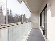 Tämän upean asunnon ehdoton helmi on kuitenkin koko huoneen levyinen lasitettu parveke, jolta avautuvat ihanat vehreät näkymät.