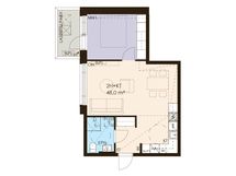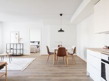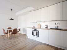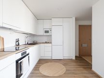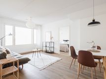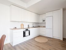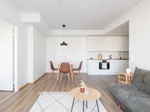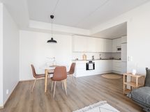 Olohuoneesta on osittain erillään oleva keittotila, joka luo selkeän ja toimivan jakamisen eri toimintojen välillä. Voit nauttia ruokailusta ja viettää aikaa olohuoneessa.