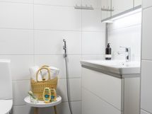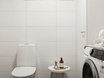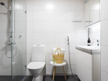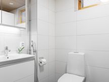 - Suihku, Suihkuseinä, Pesukonevalmius, Peilikaappi, Allaskaappi, Laattalattia, WC sekä Erillinen WC