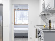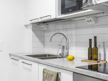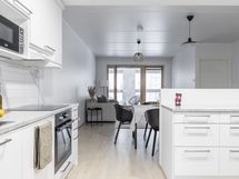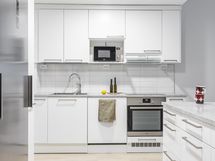 - Tilaa isolle ruokapöydälle, Paljon kaappitilaa, Paljon työskentelytilaa, Suuri tiskipöytä, Laminaattitasot, Astianpesukone, Induktioliesi, Liesikupu, Jääkaappi, Pakastin
