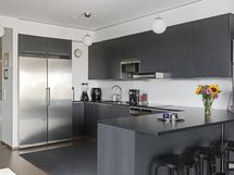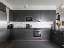 Keittiöpinnat ja koneet: keittiön työtasot Ylämään Graniitin Negro Tebas Suede matta musta, keittiökaapit Petra Tammi vaakaviilua, kalustevälitilassa valkoinen lasi, induktiokeittotaso ja kalusteuuni Siemens, mikroaaltouuni Siemens, integroitu astianpesukone Siemens, jää- ja pakastinkaappi Siemens, liesituuletin Swegon Casa Central Blues.