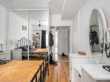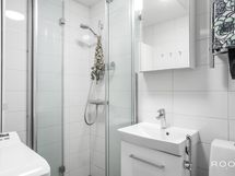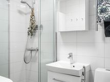 - Varustus: suihkuseinä, pesukone, pesukoneliitäntä, wc-istuin, suihku, peilikaappi, kiinteät valaisimet, kylpyhuonekaapisto.